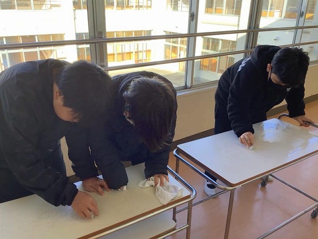 給食委員会では、1年間お世話になった配膳台をみんなで丁寧に磨きました。