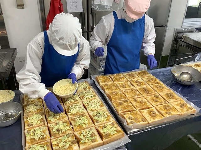 照り焼きチキンピザは、給食では初めてのメニューです。初登場ということで、調理員さんも張り切って作りました。