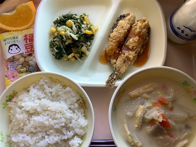 麦ごはん いわしのかば焼き 野菜の磯香和え 大豆の変身みそ汁 福豆 いよかん 牛乳 本日は節分。給食では「いわしのかば焼き」や「福豆」を提供しました。 教室では「今日は節分だ!」「豆は何個かな?」と、行事を楽しみながら味わう姿が見ら...