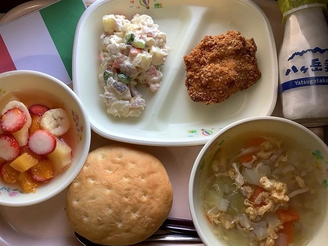 フォカッチャ ミラノ風チキンカツレツ イタリアンポテトサラダ イタリア風たまごスープ マチェドニア 牛乳 現在、ミラノ・コルティナ冬季オリンピックが熱く開催中ですね。 今日はその開催地にちなんだ、応援メニューでした。 給食を前に、子どもたち... -