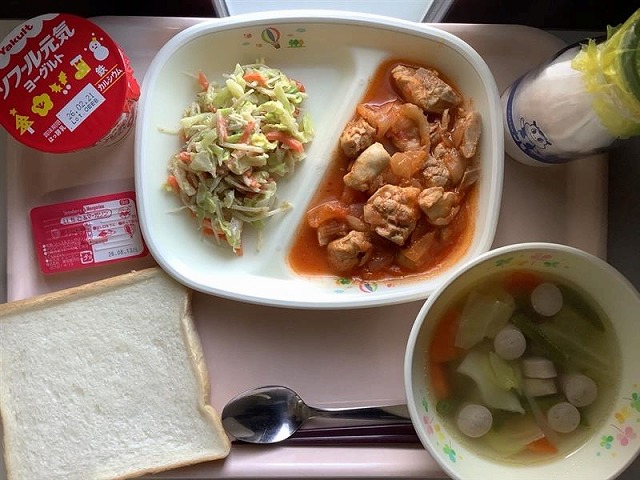 食パン(いちごジャム&マーガリン) とり肉のトマトソース煮 ごぼうサラダ ポトフ ヨーグルト 牛乳 -