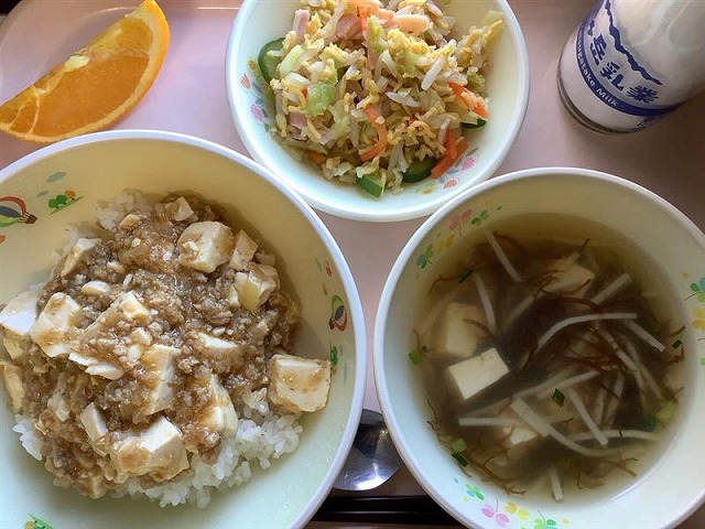 マーボー丼 中華和え もずくスープ オレンジ 牛乳 今週も風邪などによる欠席が目立っています。 給食室では、養護教諭と連携して各クラスの状況を把握し、なるべく食品ロスを出さず、登校しているみなさんがおいしく食べられるよう量の調整を行... -